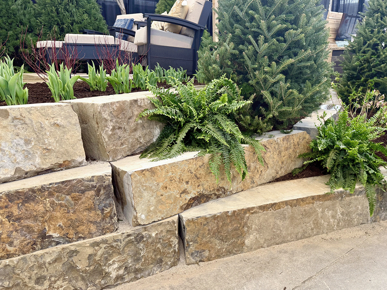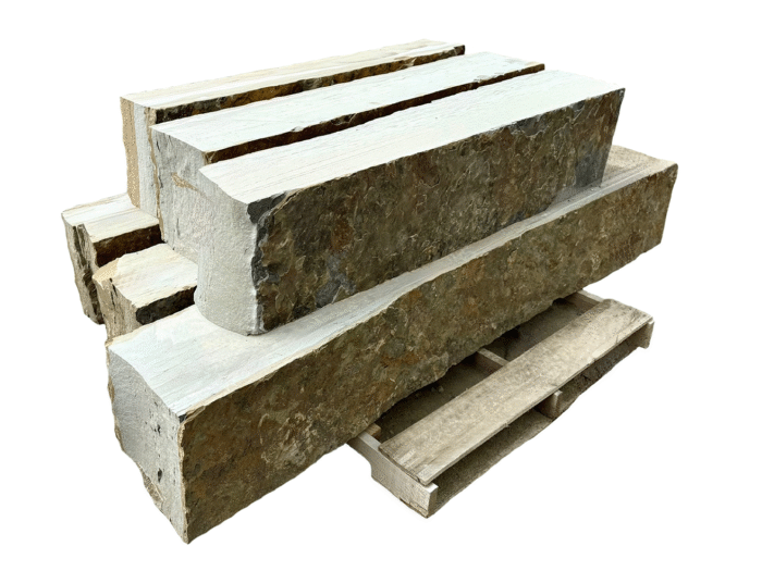 Earth-toned sandstone, boasting buff tans and rich black and brown hues, exudes depth and character. Available in sawn heights of 10″ to 12″, depths ranging from 10″ to 12″, and lengths spanning 36″ to 84″, this stone presents a versatile range of options for your project. The blocky, linear boulders feature a sawn flat top and bottom, making them ideal for constructing expansive retaining walls with a touch of sophistication. Approximate coverage of 14 sf/ton.