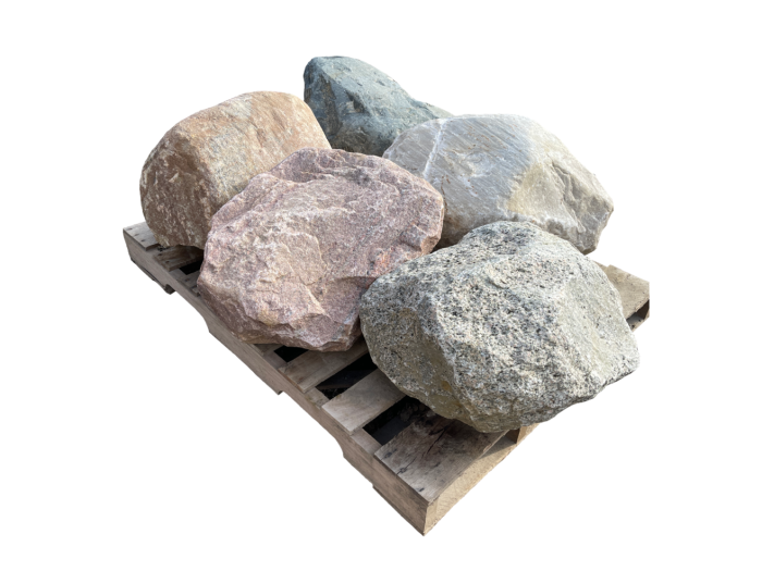 Smooth, rounded granite boulders featuring a striking mix of pink, blue, white, and green hues. With a longest diameter of 18″ to 24″, these boulders are perfect for smaller-scale retaining walls, decorative accents, natural barriers, or enhancing water features. Their unique colors and shapes make them ideal for creating stunning focal points in any landscape or hardscape design.  Approximate coverage of 10 face feet per ton